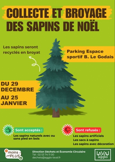 À l’issue des fêtes de fin d’année, Laval Agglomération propose aux habitants une solution simple et responsable pour se débarrasser de leur sapin de Noël. Dans le cadre de sa démarche en faveur de l’économie circulaire, une collecte et un broyage des sapins naturels sont mis en place.